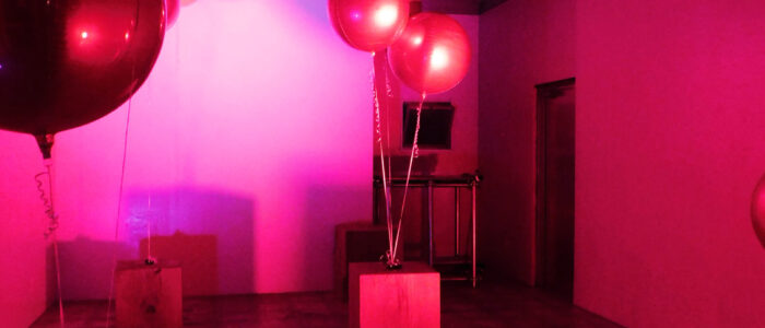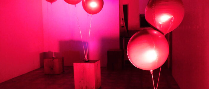 戦争時代の鉄片を無数の風船が空中へと持ち上げるインスタレーションです。